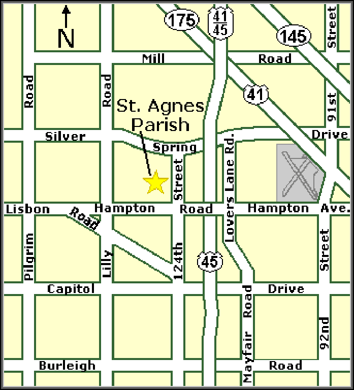 From Hampton Road, take 127th Street north three blocks to first stop sign (Fairmount Avenue). Turn left (west) on Fairmount Avenue to the main entrance of St. Agnes Church and School, at 12801 West Fairmount Avenue.