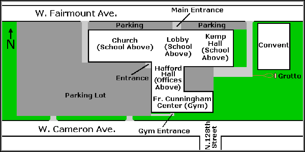 The main entrance into the Fr. Cunningham Center is at 12800 West Cameron Avenue, Butler, Wisconsin.
