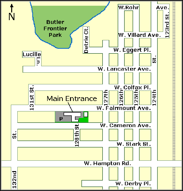 To get to Butler, take U.S. Hwy 45 to Hampton Avenue (exit 45). Take Hampton Avenue west to 127th Street. Turn right (north) on 127th Street to first stop sign (Fairmount Avenue). Turn left (west) on Fairmount Avenue to the church and school.